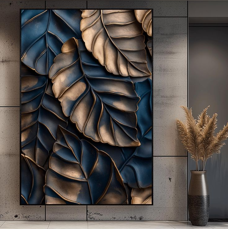 Elevate your space with this handcrafted 3D wall art featuring abstract leaves in deep navy and shimmering gold leaf.... -