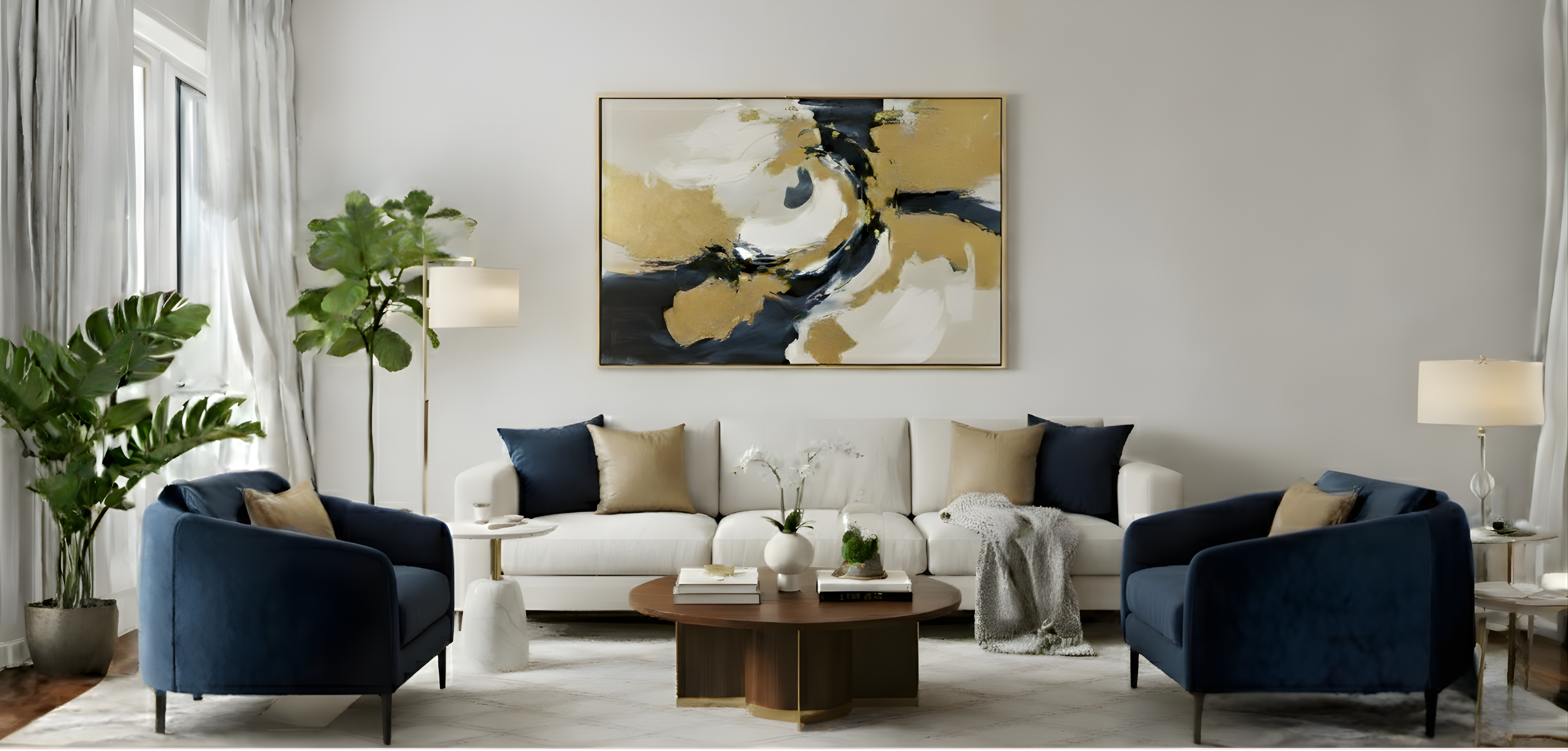 Add a touch of glamour to your home with abstract gold-accented leaves. Rich navy hues bring a calming yet striking look to any space.A perfect centerpiece for living rooms, bedrooms, or offices.
