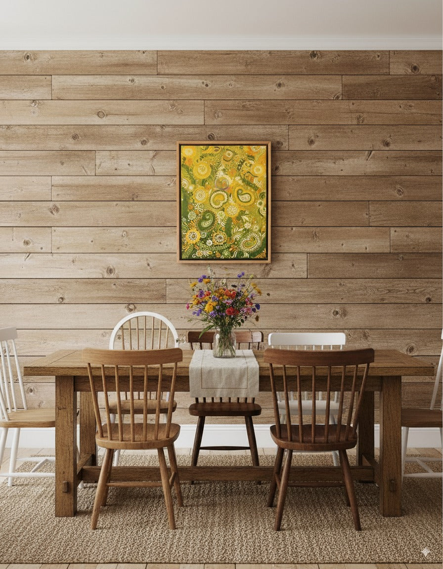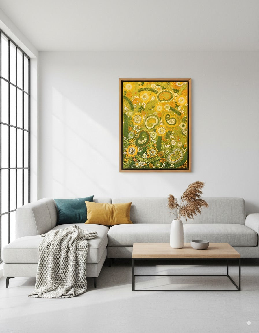 Handmade Lippan & Mehndi design artwork with resin coating. Elegant textured wall art in vibrant yellow and green for modern and luxury interiors.