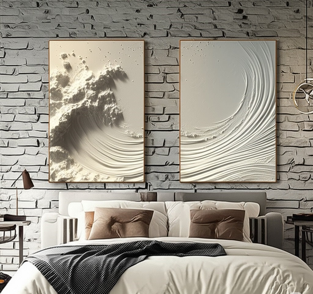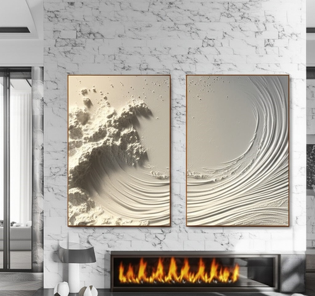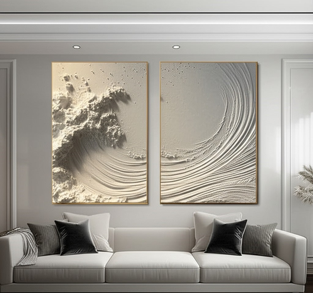 Modern textured wall art diptych with abstract sand wave patterns. Elegant 3D artwork in calming neutral tones for living rooms, bedrooms, and offices.