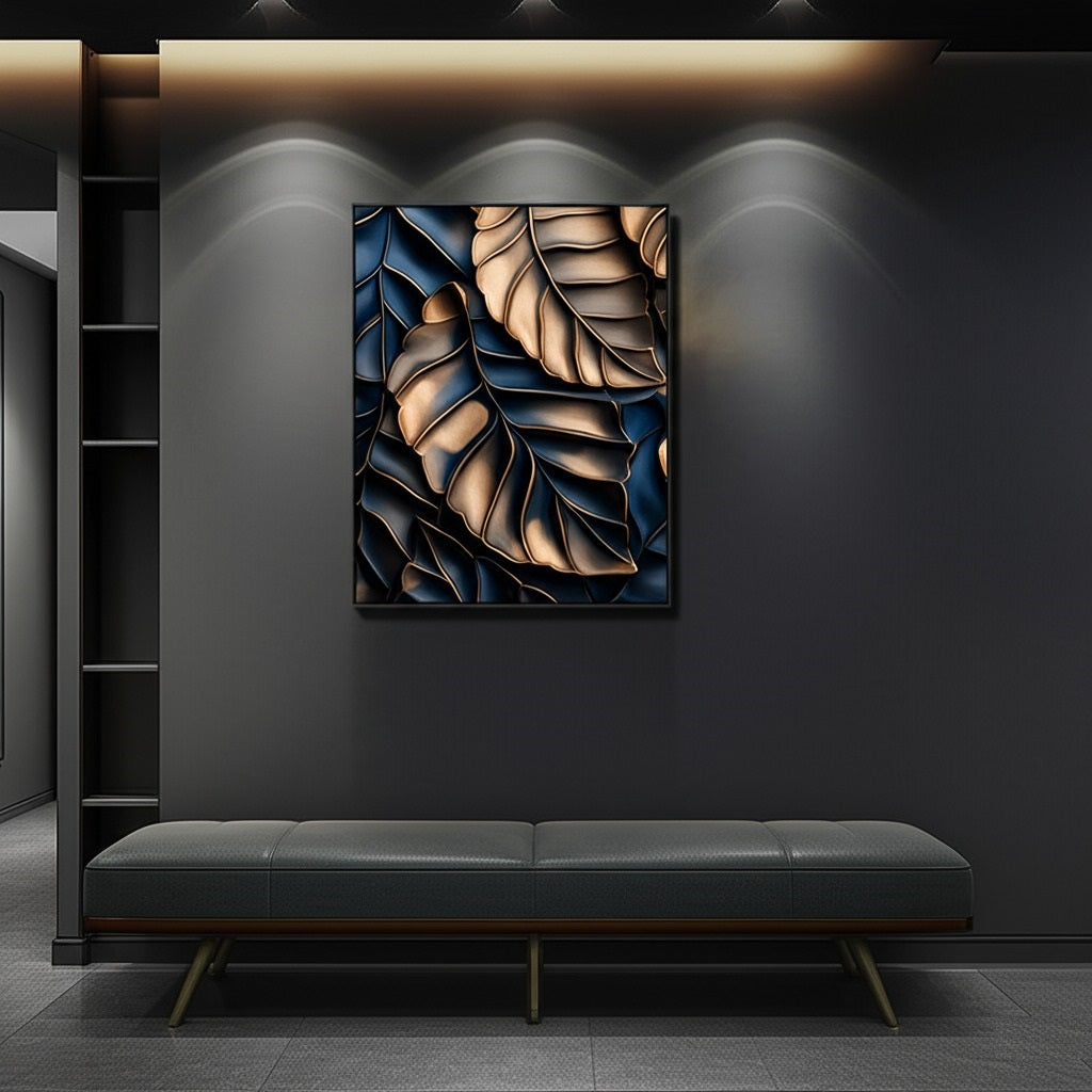 Elevate your space with this handcrafted 3D wall art featuring abstract leaves in deep navy and shimmering gold leaf. It is a perfect blend of nature, luxury, and minimalism.