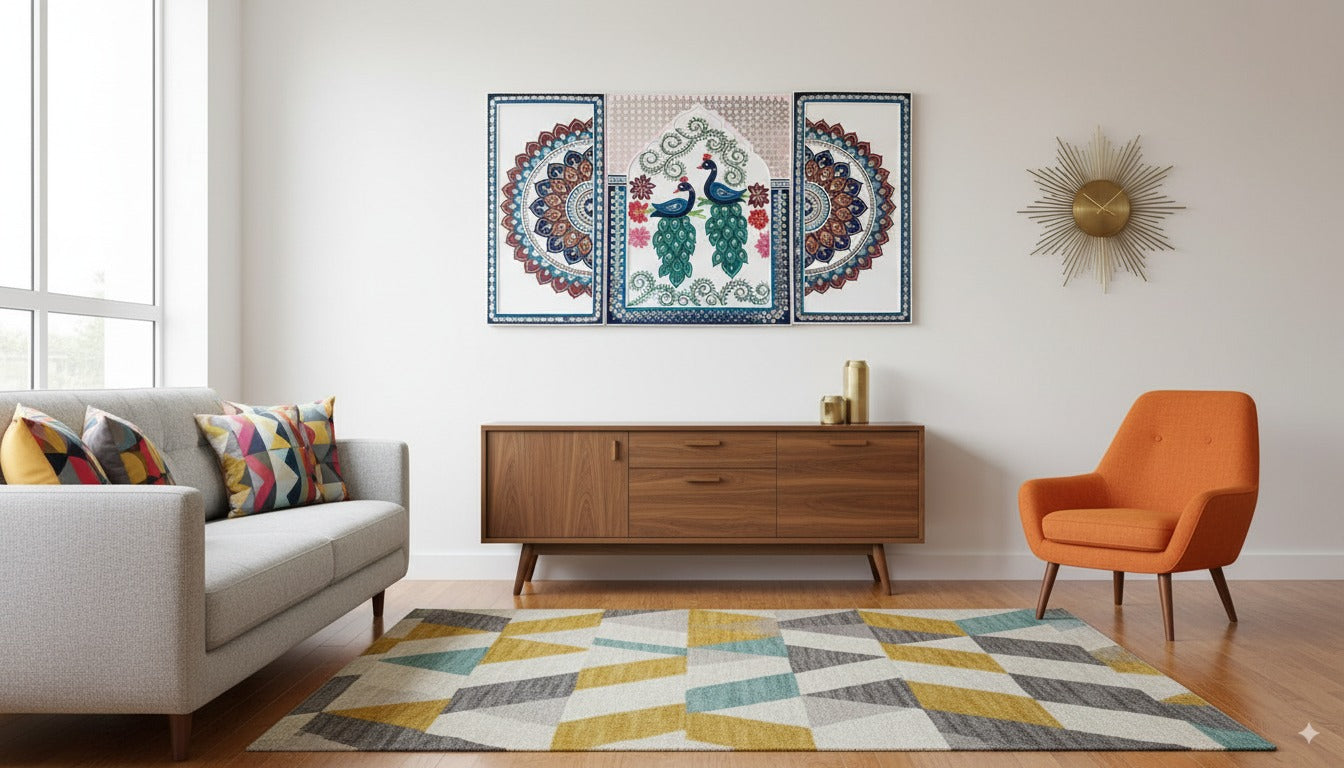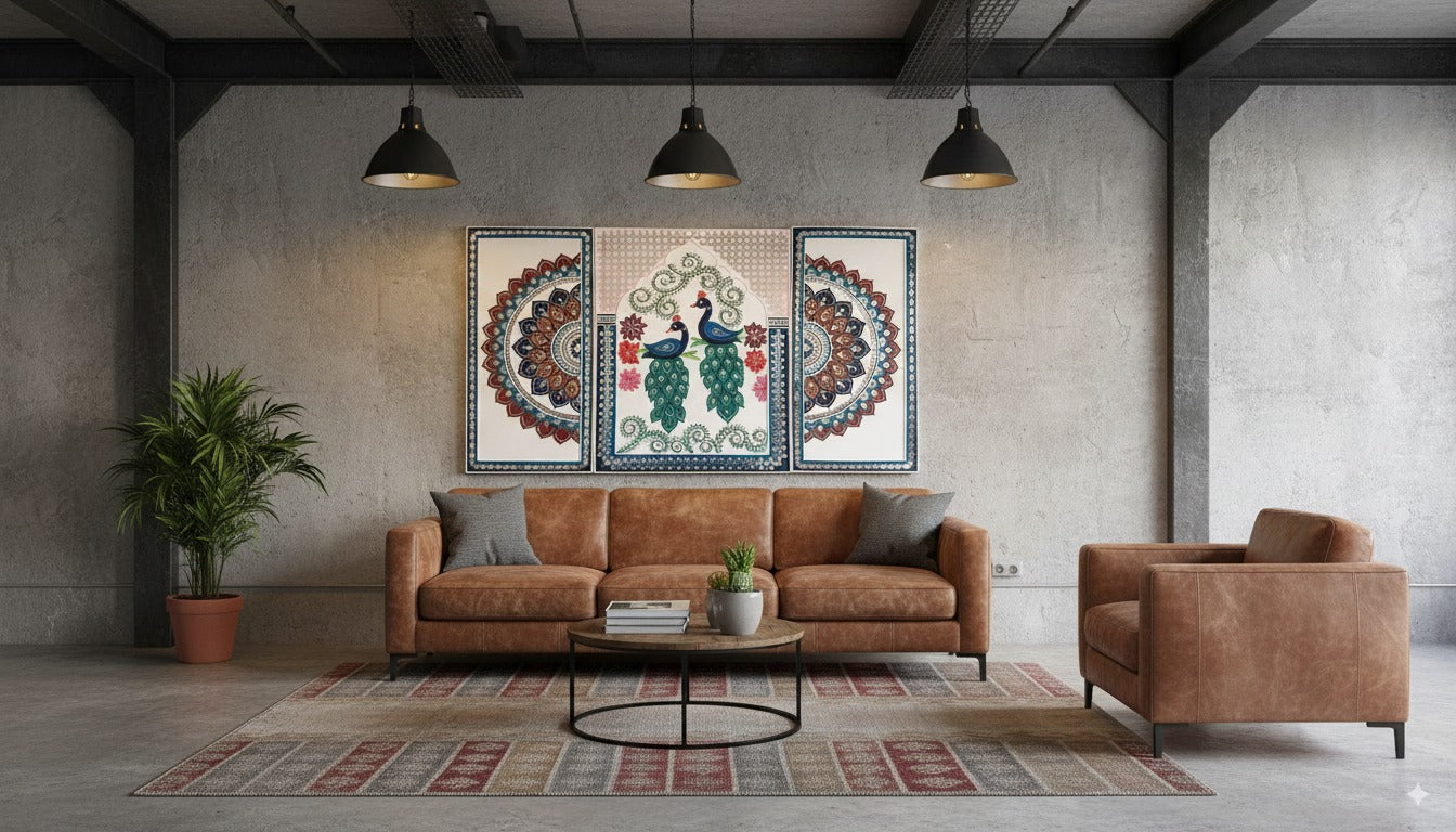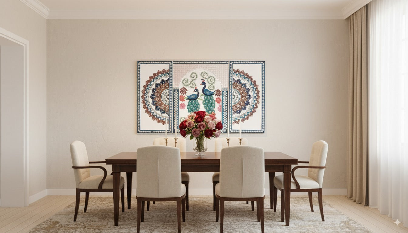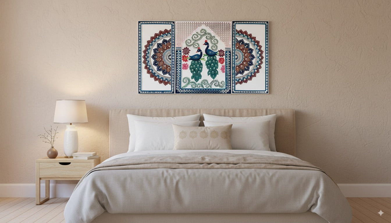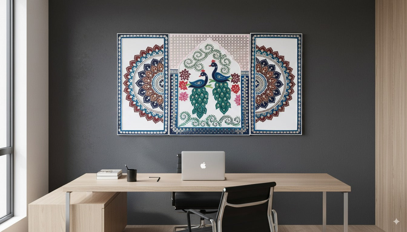 Handmade Lippan art set of 3 panels with peacocks and mandala patterns. Elegant textured wall art to elevate living rooms, bedrooms, and offices.